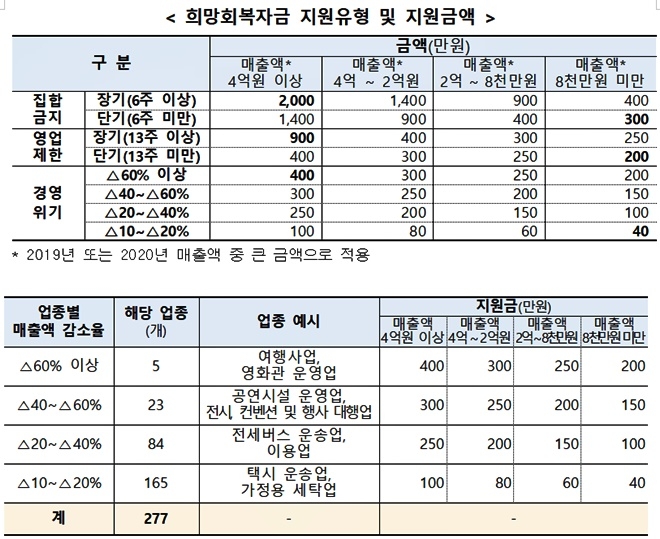 지난 3월 1차 추경 당시, 집합금지나 영업제한 조치가 없었던 일반업종 가운데 매출 감소가 큰 '경영위기업종'을 선정하여 일반업종보다 많은 지원금을 지원했다. 소상공인 희망회복자금 매출 기준은 해당 사업체에 유리한 매출액을 기준으로 적용 합니다. 경영위기업종은 코로나19로 인해 매출액이 감소한 사업체로 2019년 대비 2020년 평균 매출이 10% 이상 감소했다면 신청이 가능합니다. 2억 원 8천만 원) 이 세 가지로 결정 이 됩니다. 소상공인 희망회복 자금 일반업종 경영위기업종 정리!